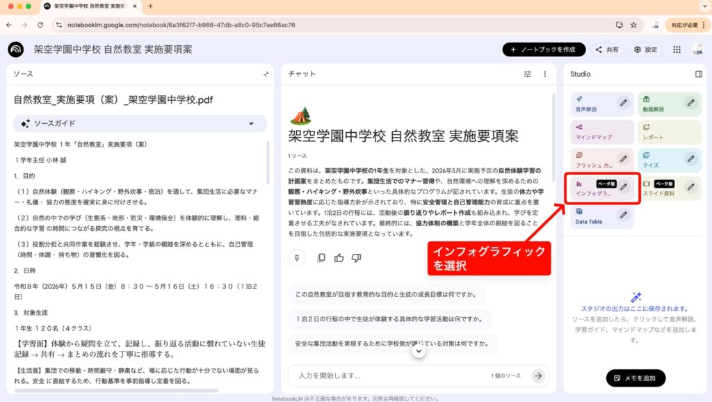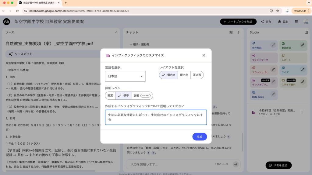NotebookLMに行事ごとにノートを作成して、いろいろな資料を入れることで、自分が知りたいことがあるときにはチャットで質問をできるし、ここ一番で生徒に伝えたい情報があるときにはインフォグラフィックなどで出力することができます。