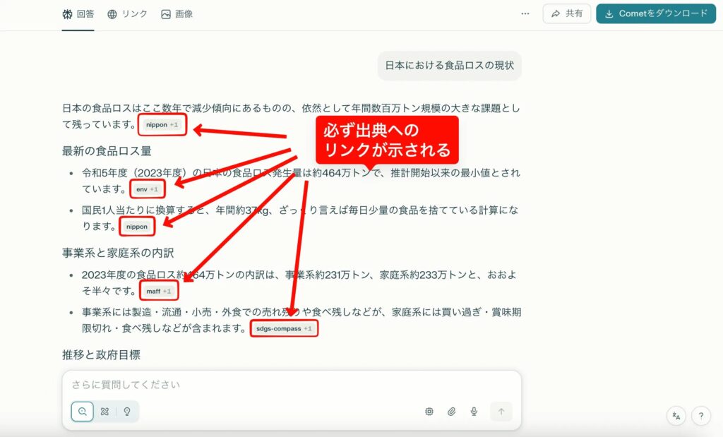 例えば、食品ロスの現状についてPerplexity AIに聞いてみると以下のようになります。