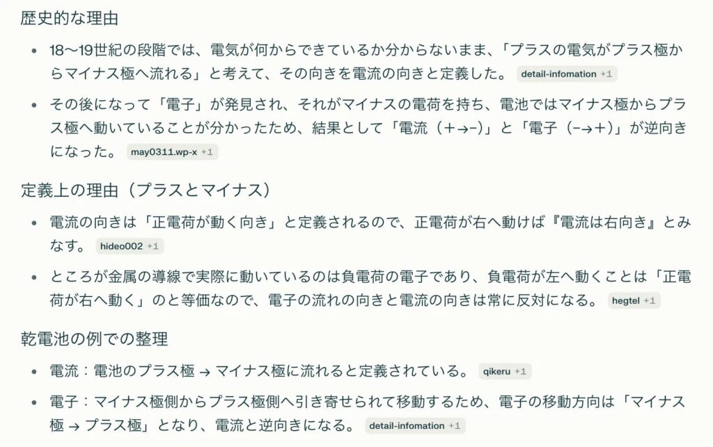 たとえば理科の授業で、電流と電子の流れる向きが逆向きに定義されている理由を調べると以下のような結果が返ってきました。