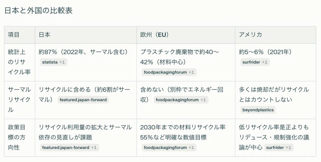 たとえば、プラスチックリサイクルについて調べてみました。プラスチックリサイクルの現状について、日本と諸外国を比較して調べることができます。Perplexity AIは以下のように表にまとめてくれました。