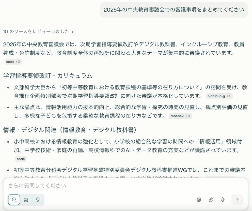 たとえば2025年の中央教育審議会でどのようなことが検討されているのかをAIに聞いてみた結果です。